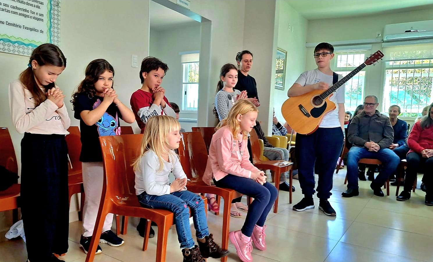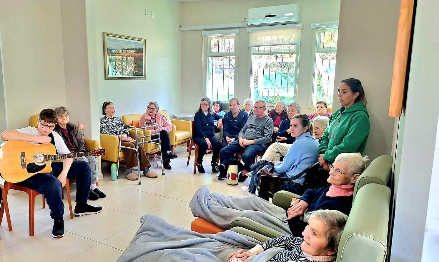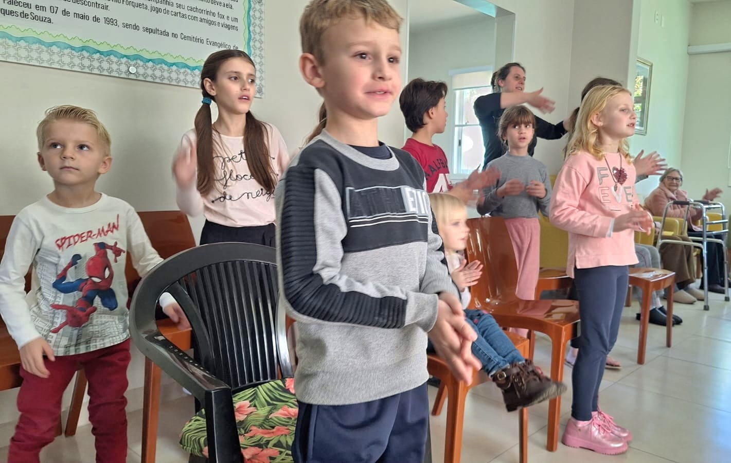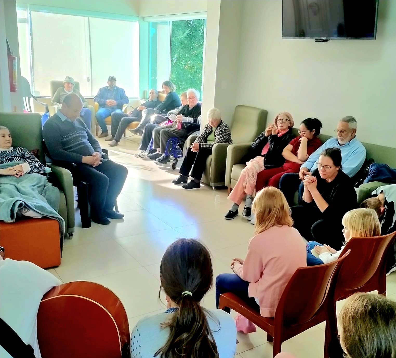 Durante o encontro, o grupo entoou canções de louvor especialmente escolhidas para envolver crianças e idosos em um ambiente de união e alegria. A programação seguiu com instantes de integração, permitindo que os pequenos conhecessem as histórias de vida dos hóspedes do lar e compartilhassem também suas vivências.