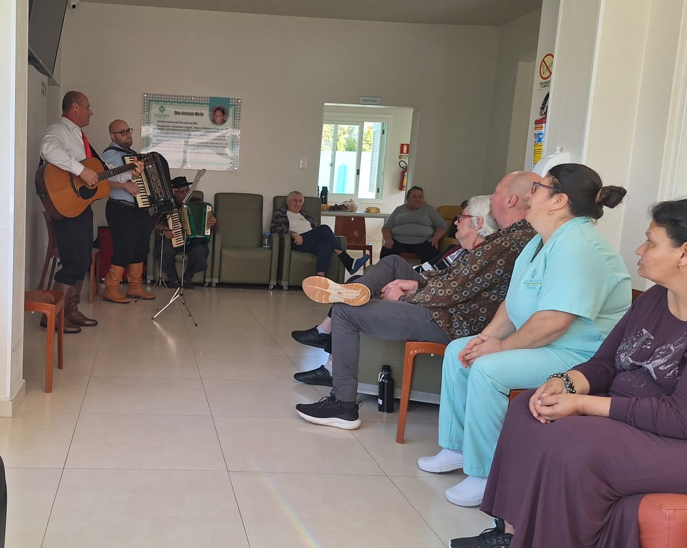 Os hóspedes do Lar Dona Dora vivenciaram uma tarde especial de valorização da cultura gaúcha, com apresentações musicais e danças típicas que emocionaram a todos os presentes.